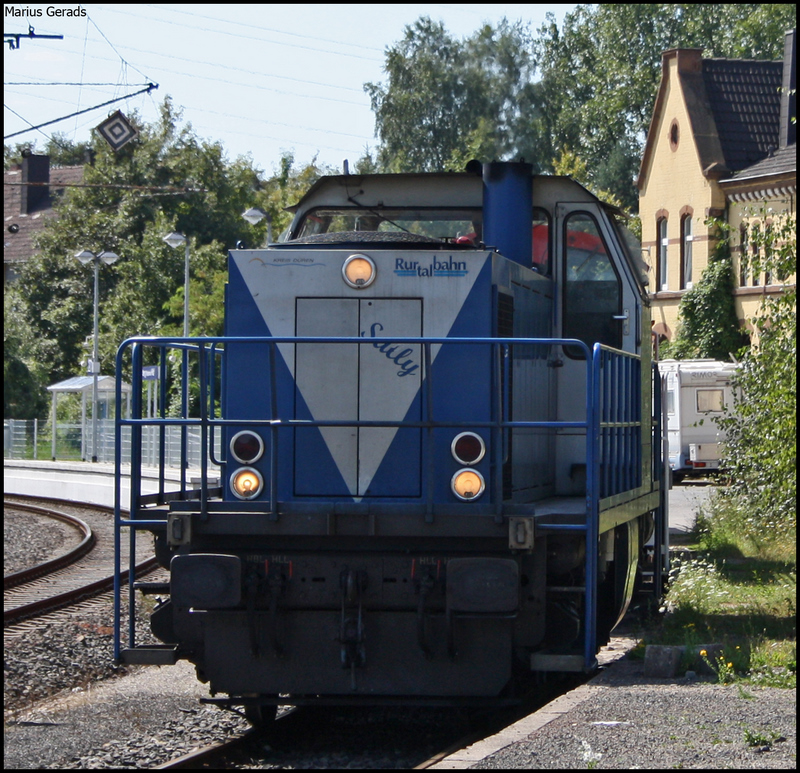 Die 1966 von Henschel erbaute D5 Schmalspurdiesellok der Brohltalbahn, mit Lampen der BR 215, zieht den Vulkanexpress in den kleinen Bahnhof Brohl, aufgenommen am 11.08.2009