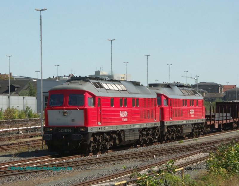 Vom Zugang zu einer Kleingartenanlage aus konnten am Mittag des 24.08.2009 in Hof die beiden 232 905 und 902 mit grossen "Hollandlatz"- Lackflächen vor einem Gz gesehen werden.
