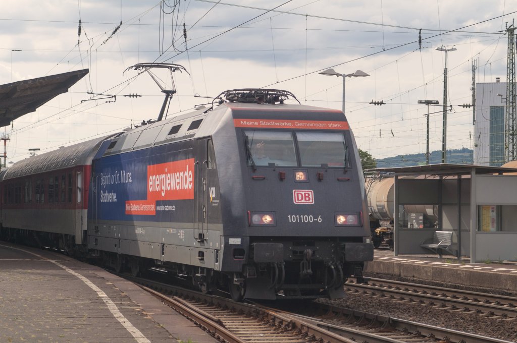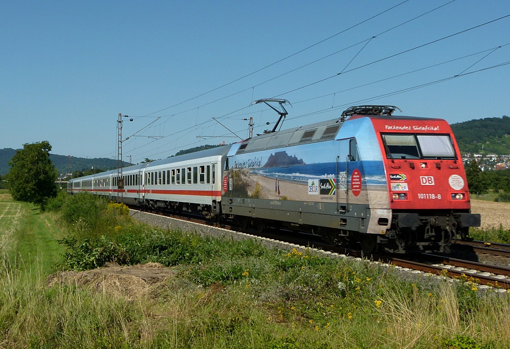 101 118-8 (Packendes Südafrika) ist mit dem IC 2054 Frankfurt (Main) - Saarbrücken am 01.08.2012 in Lützelsachsen