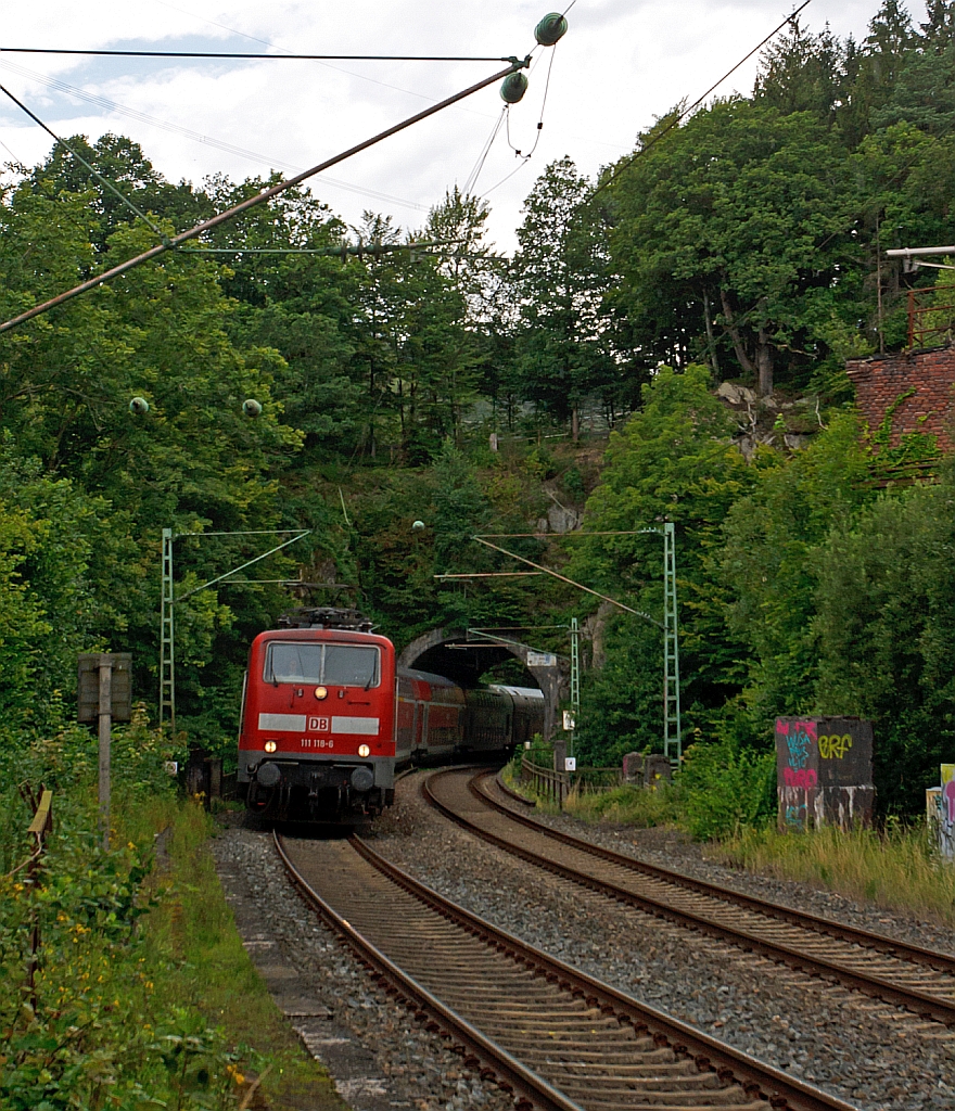 111 118-6 mit RE 9 (Rhein-Sieg-Express) Aachen - Köln - Siegen rauscht hier am 04.08.2012 aus dem Scheuerfelder Tunnel und überquert die Sieg. Hier in Scheuerfeld wird nicht mehr gehalten, der nächte Halt ist Betzdorf/Sieg.