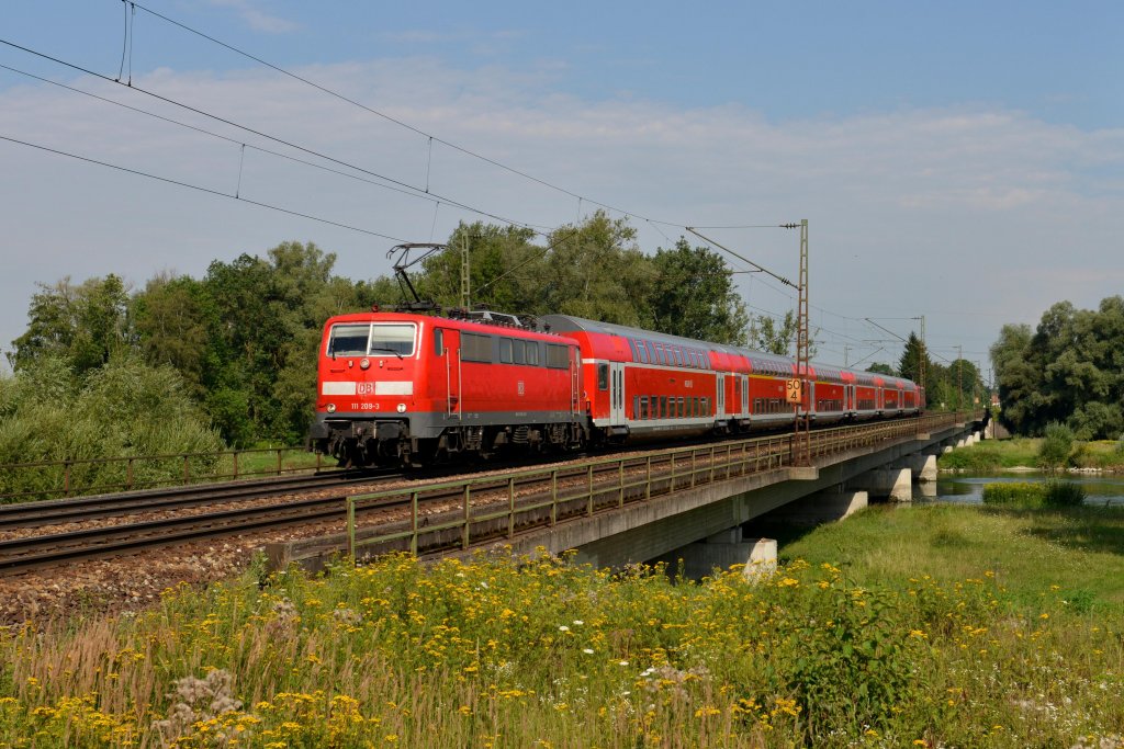 111 209 mit RE 4062 von München Hbf nach Passau Hbf am 02.08.2012 bei der Überquerung der Isar in Plattling.