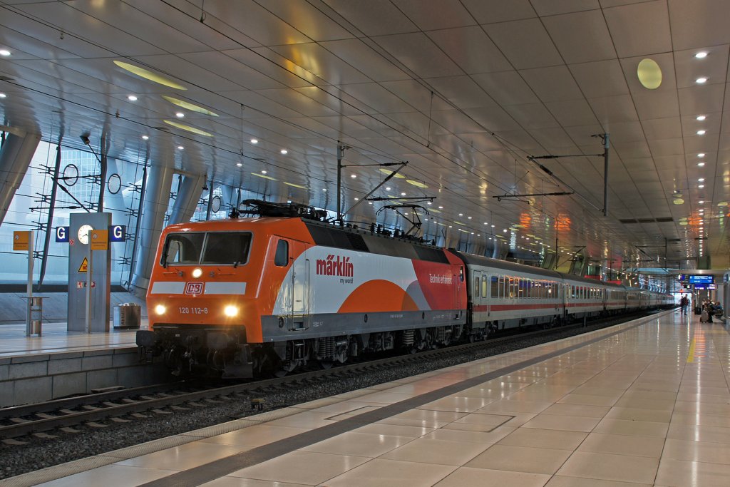 120 112-8 "Märklin myWorld" steht mit IC 2329 Neumünster - Nürnberg Hbf in Frankfurt-Flughafen Fernbf. 06.05.12