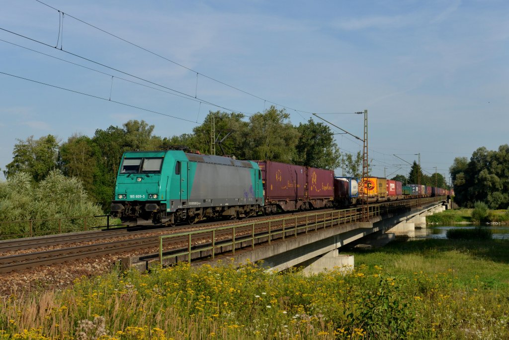 185 609 mit einem Containerzug am 02.08.2012 bei der Überquerung der Isar in Plattling.