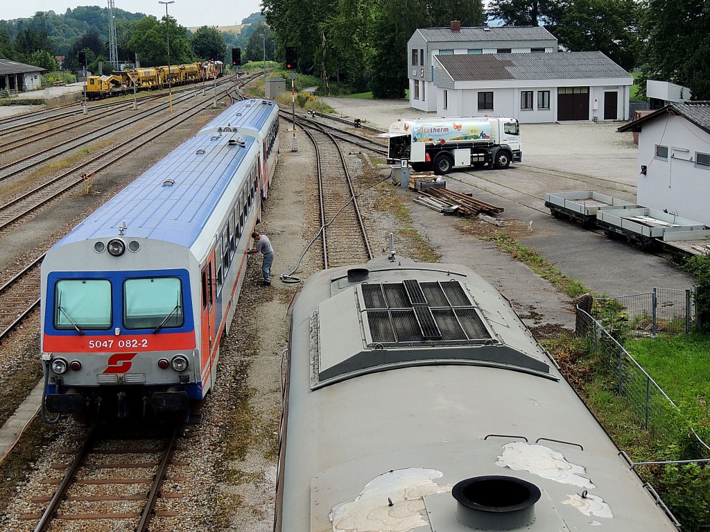 5047 082-2 wird als erstes Bahntriebfahrzeug am Rieder Bahnhof eine Tankfüllung direkt vom Liefer-LKW erhalten; 120804