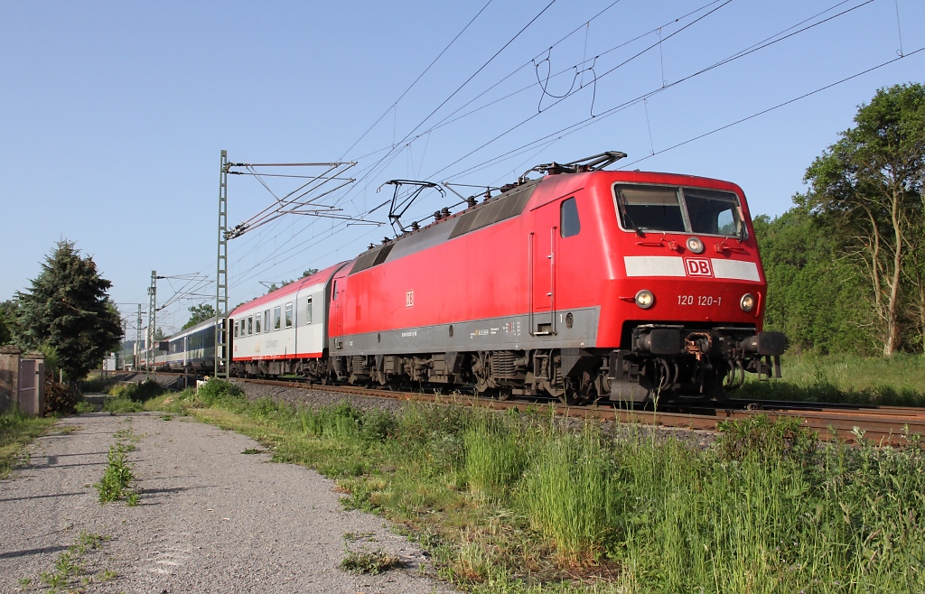 Arge Verspätungen ärgern den Fahrgast, den Fotografen freut es. So konnte der EN 490 auf seiner Fahrt nach Norden mit 120 120-1 an der Nordeinfahrt nach Eschwege fotografiert werden. Aufgenommen am 22.05.2012.
