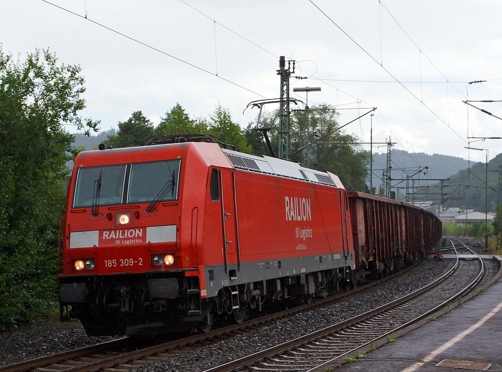 Bei Regen - Die 185 309-2 der DB Schenker Rail zieht am 04.08.2011 einen Ganzzug mit Offenen Wagen der Gattung Eanos durch Scheuerfeld (Sieg) in Richtung Köln.