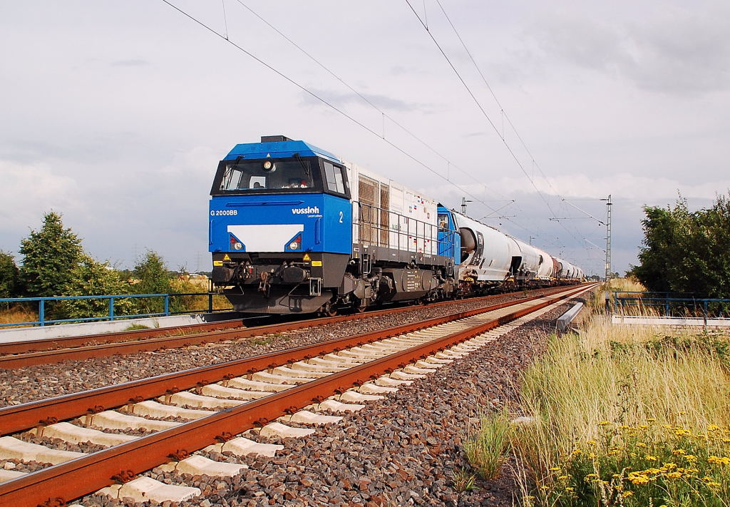Da ist die Vossloh BB 2000/ 272 001-5(92 80 1272 001-5D-VL) mit einem Silowagenzug am Freitag den 3.8.2012 auf der K 33 Brücke bei Allerheiligen in Richtung Neuss unterwegs.