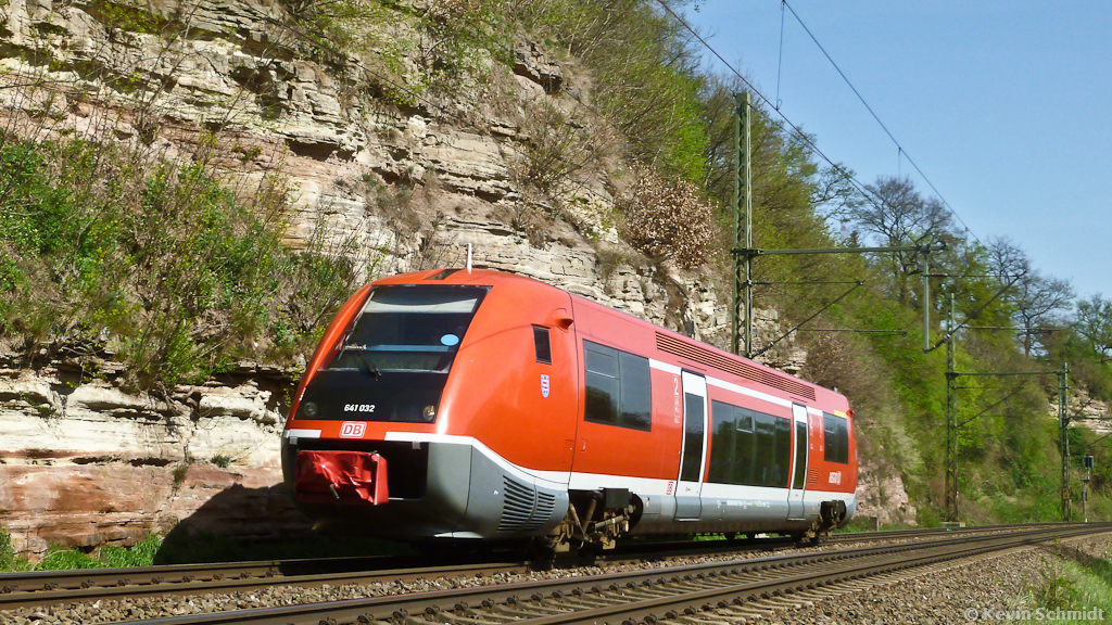 Ein Fahrzeugporträt vor der charakteristischen Buntsandstein-Kulisse bei Kahla: Bevor DB Regio den Verkehr im Dieselnetz Ostthüringen an die Erfurter Bahn abgeben musste, kamen noch einmal (nach einigen Jahren) die Walfische VT 641 auf der Strecke Jena - Pößneck (Orlatalbahn) als RB zum Einsatz. (28.04.2012)