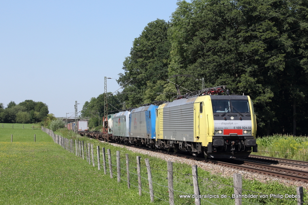 ES 64 F4 - 024 (TX Logistik) fährt am 27. Juli 2012 um 15:37 Uhr mit einem Güterzug durch Großkarolinenfeld