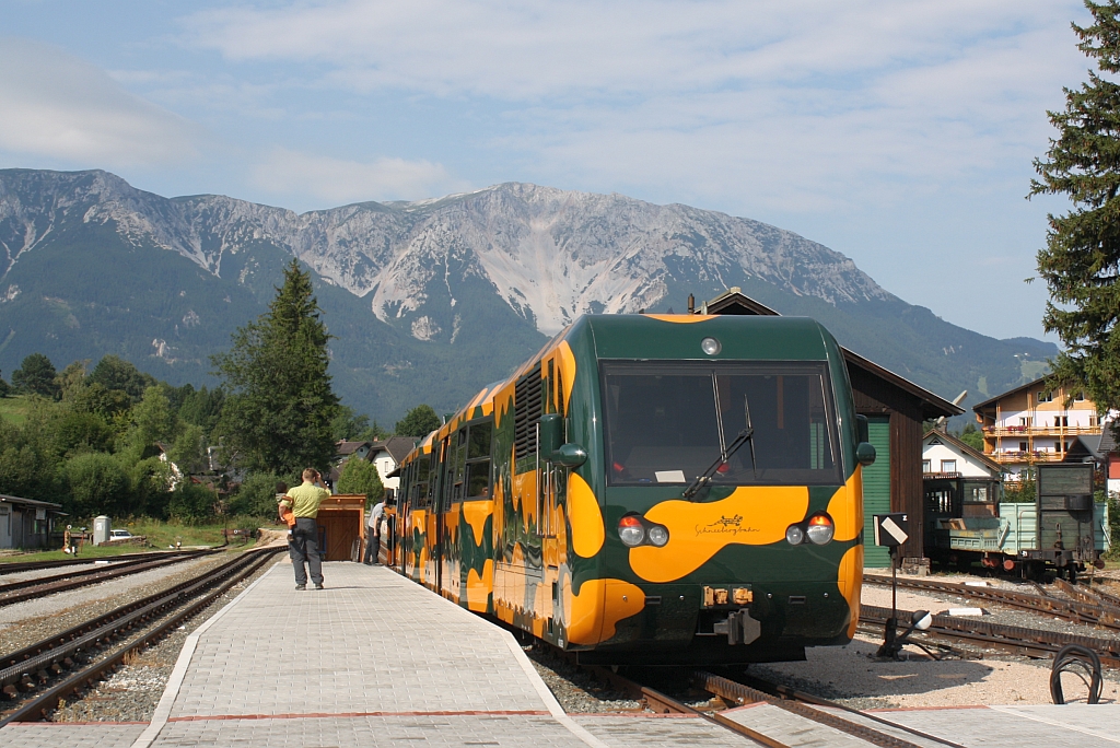 NÖSBB 11 am 04.08.2012 im Bf. Puchberg. Im Hintergrund das Ziel des Zuges, der Schneeberg.