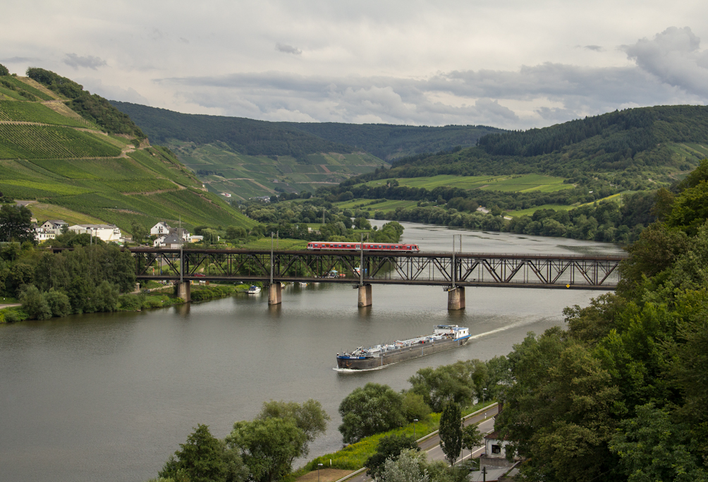 628-648 rollte am 2.8.2012 als RB nach Traben Trarbach über die Moselbrücke in Bullay.