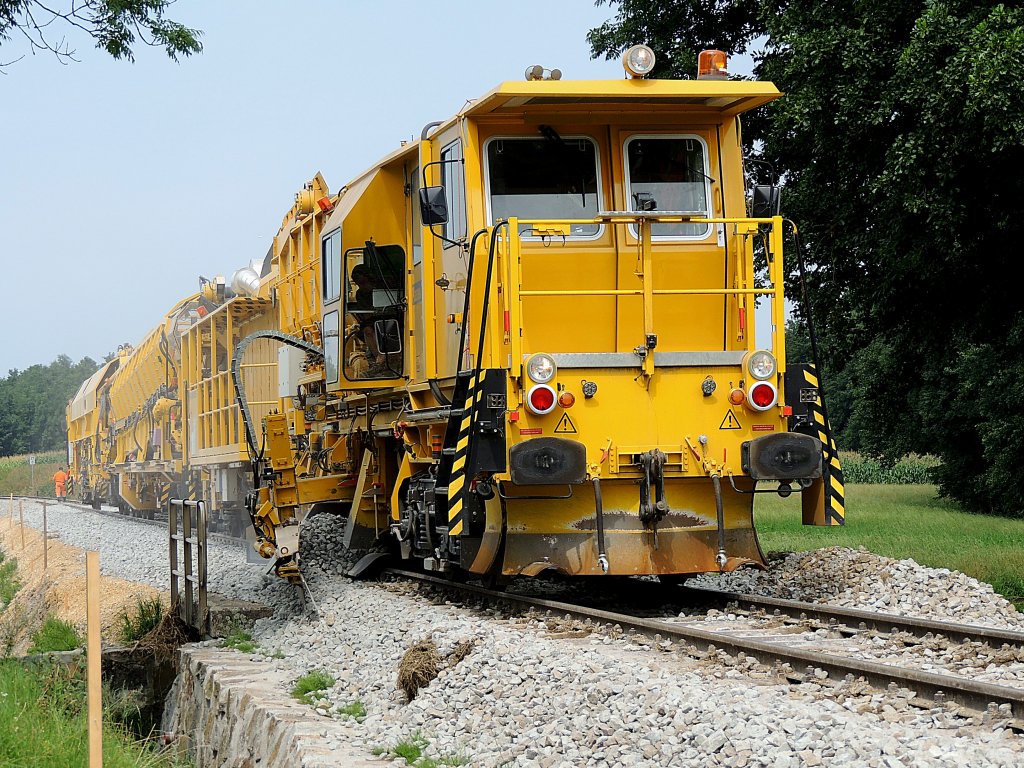 DYNAMIC-STOPFEXPRESS 09-4X(SKL-X962006-7) arbeitet sich nach den Hochwasserschäden auf der geneigten Innkreisbahn bei Mehrnbach Meter für Meter vor; 120804