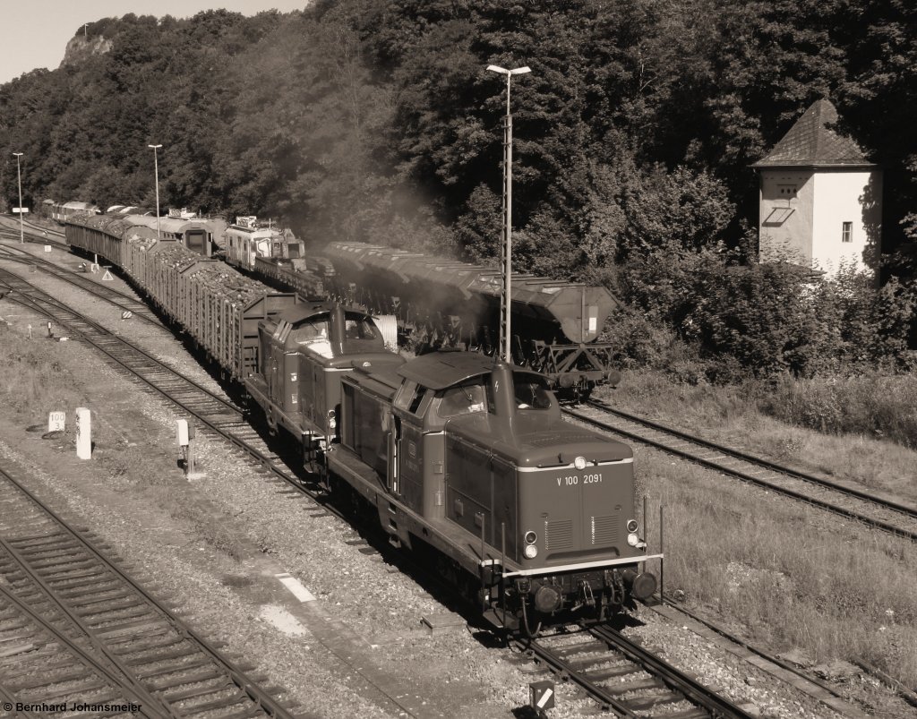 Die beiden V 100 der VEB bringen den Holzzug von Gerolstein nach Euskirchen, wo die Wagen von der DB weiter Richtung Köln gebracht werden. August 2012
