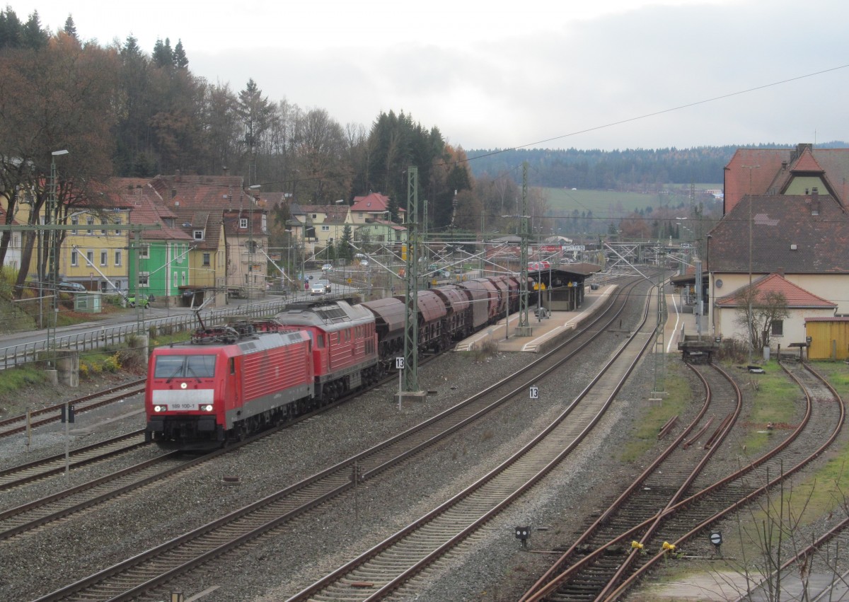189 100-1 zieht am 23. November 2013 die 232 xxx und einen gemischten Güterzug durch Kronach in Richtung Lichtenfels.