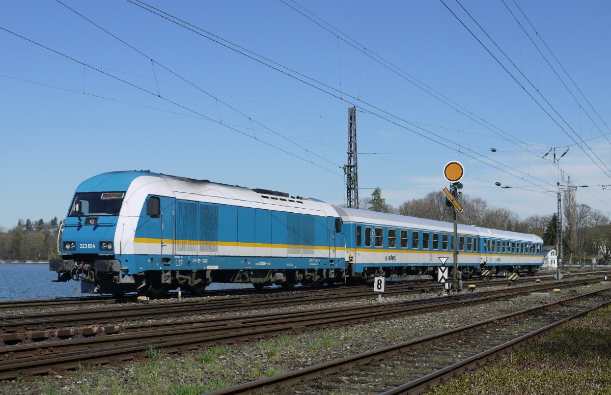 Am 10.4.2012 bringt 223 064 einen Mini-Alex über den Bodensee-Damm zum Lindauer Hauptbahnhof.