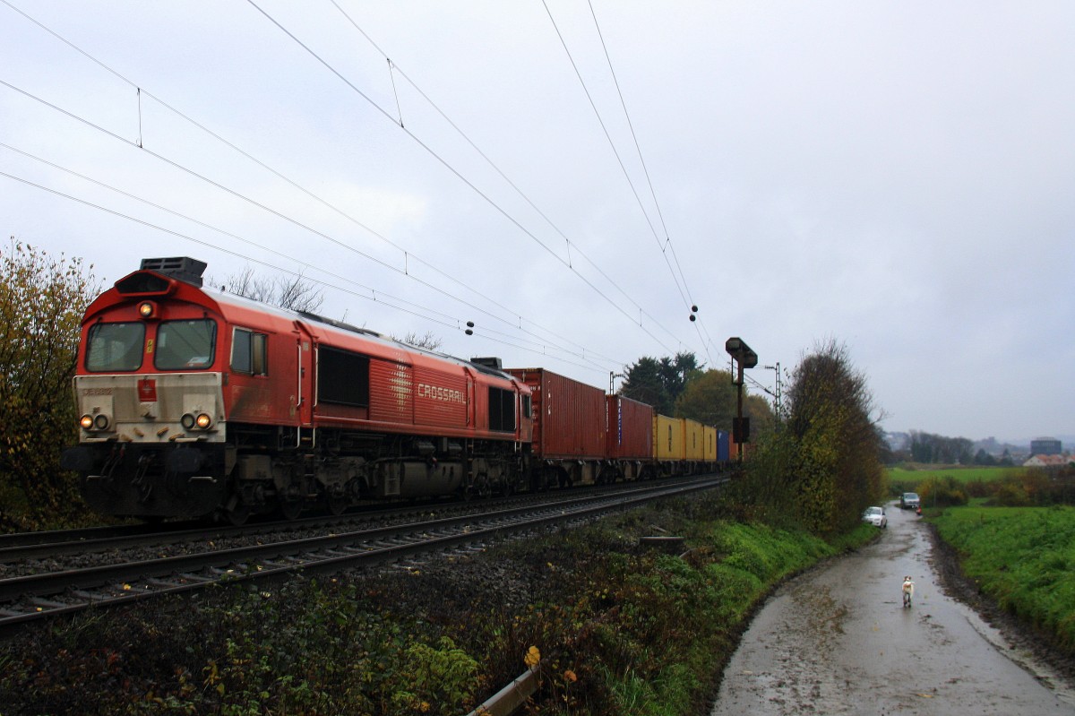 Die Class 66 DE6312 "Alix" von Crossrail kommt aus Richtung Aachen-West und fährt die Gemmenicher-Rampe hoch mit einem sehr langen MSC-Containerzug aus Weil Am Rhein(D) nach Antwerpen-Berendrecht(B). Aufgenommen an der Montzenroute am Gemmenicher-Weg am 24.11.2013.