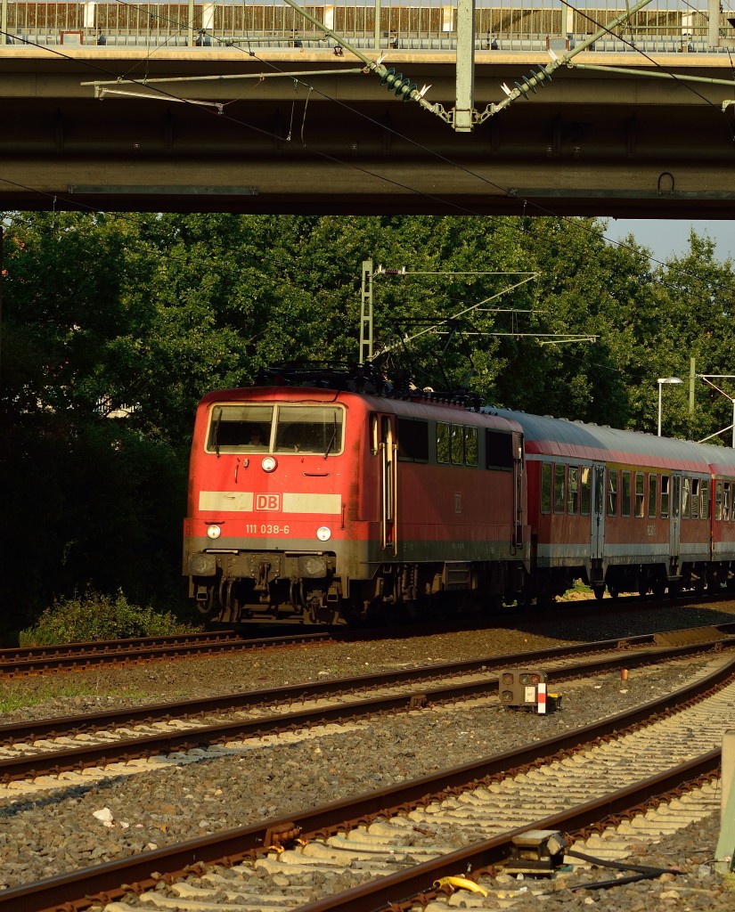 111 038-6 am 1.8.2014 in Korschenbroich mit einem Verstärkerzug auf der RE4 nach Aachen.