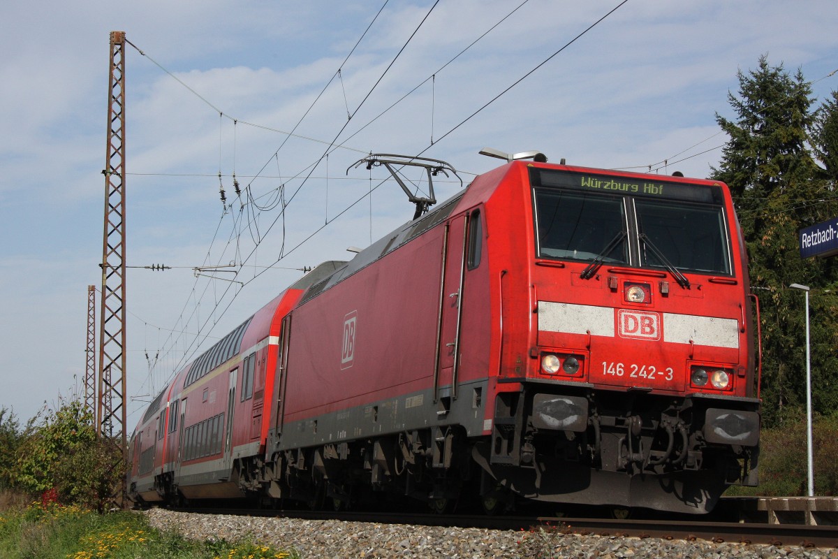 146 242 am 27.9.13 mit einem RE in Retzbach-Zellingen.