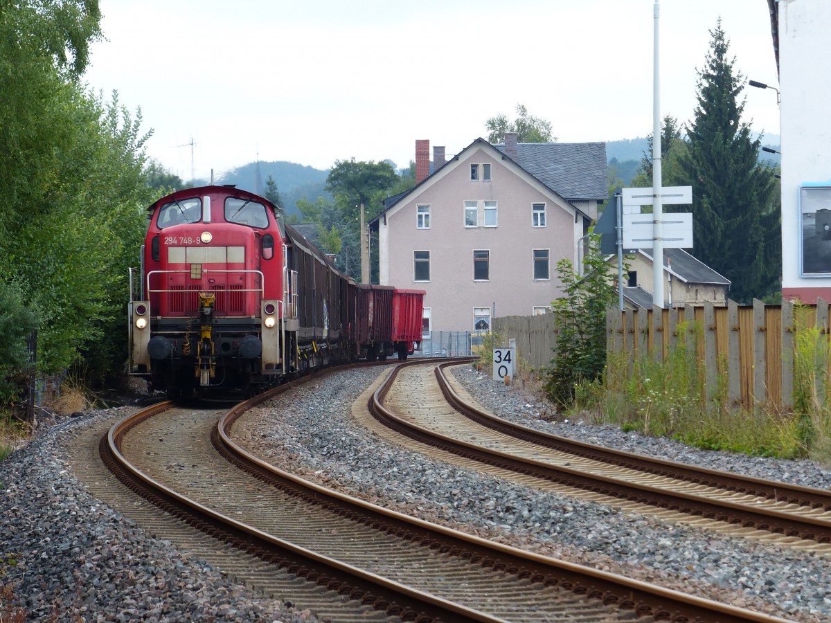 294 749 mit einen kurzen Güterzug am Haken fährt am 05.08.2014 durch den Hp. Cainsdorf in Richtung Zwickau.