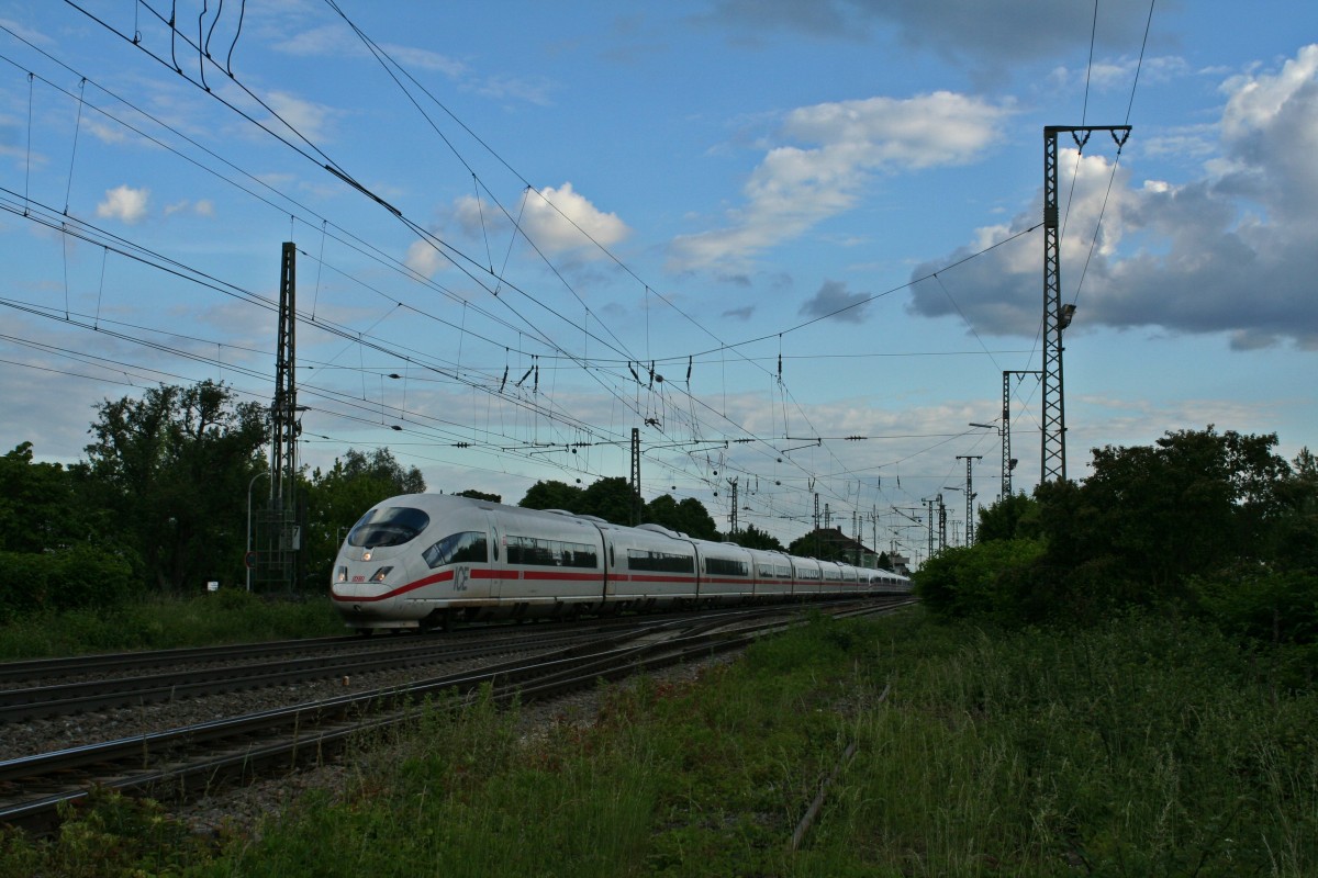 403 052-4 und 403 017-7 als ICE 100 auf der Fahrt von Basel SBB nach Dortmund Hbf am Abend des 24.05.14 beim Verlassen des Bahnhofs Müllheim (Baden).