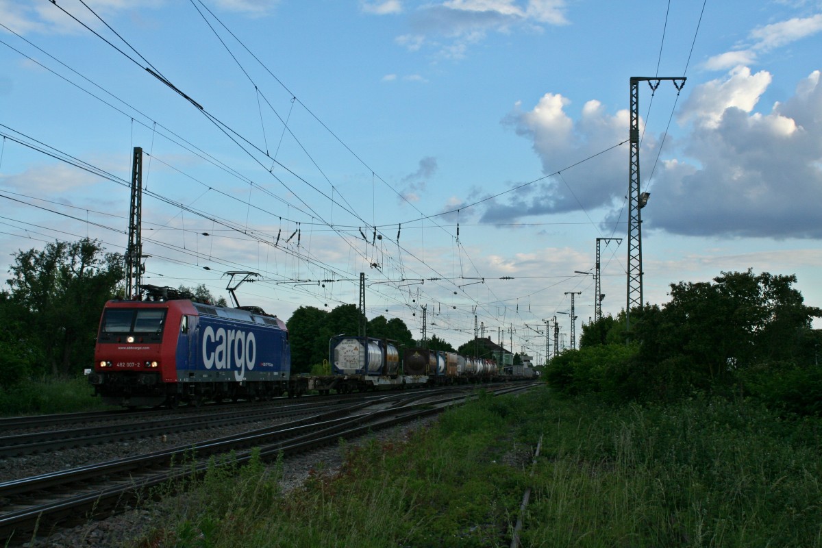 482 007-2 mit einem gemischten KLV-Zug aus der Schweiz in Richtung Norden am Abend des 24.05.14 in Müllheim (Baden).