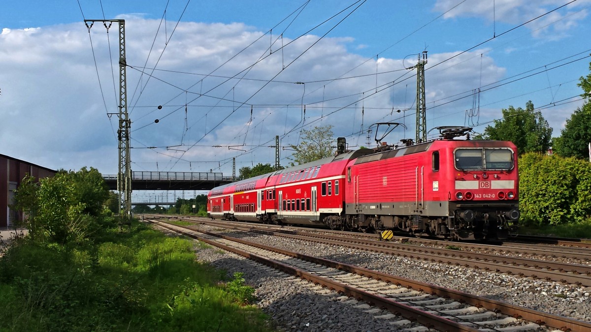 Am 14.05.2014 schiebt die Freiburger 143 042-0 eine HVZ-RB aus dem Bahnhof von Müllheim (Baden) gen Freiburg aus.