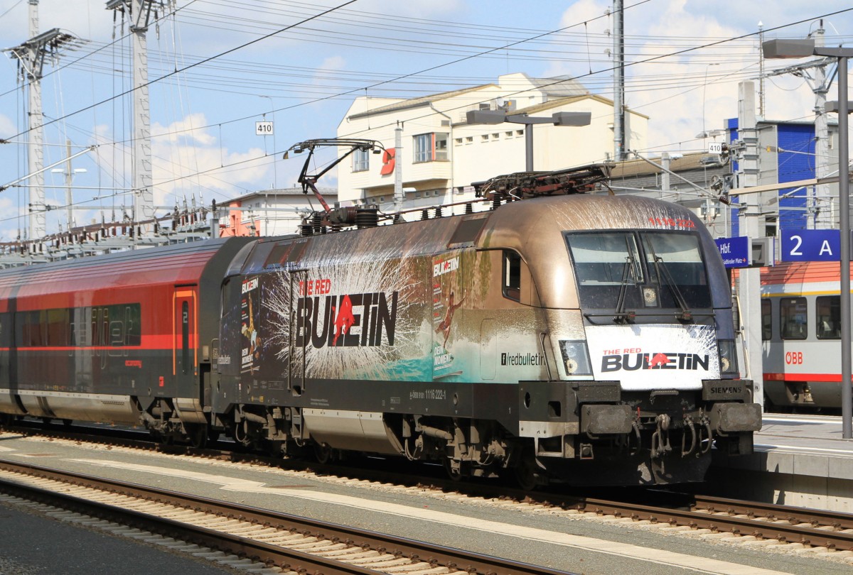 Die 1116 222 mit Railjet bei der Einfahrt in den Hbf Salzburg am 03.08.2014