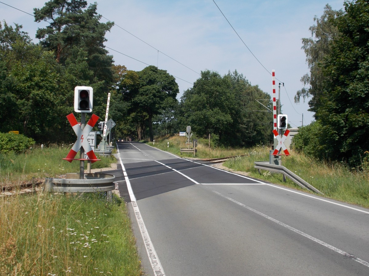 Die Straße von und nach Grimmen überquert bei Utzedel die Bahnstrecke Stralsund-Neustrelitz.Aufnahme vom 20.Juli 2014.