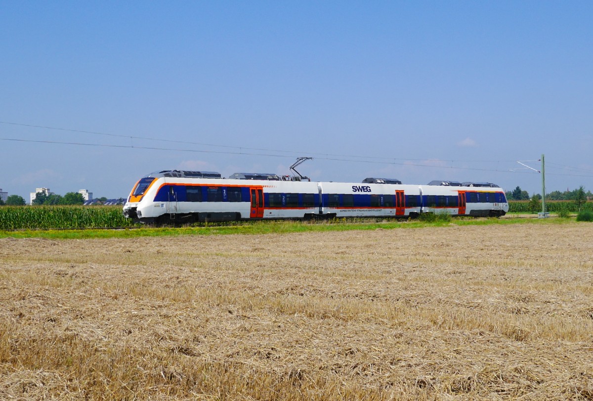 ET 150 (94 80 1442 150 D-SWEG) auf der Münstertalbahn in der Nähe des Hp Oberkrozingen, Richtung Bad Krozingen fahrend (Aufnahme vom 1.8.14).