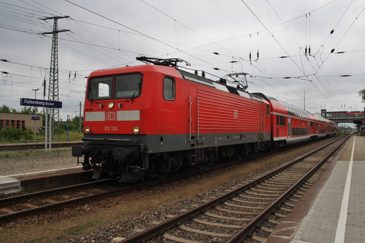Hier 112 124 mit einem RE5 (RE18510) von Falkenberg(Elster) nach Stralsund Hbf., dieser Zug stand am 12.7.2014 in Flakenberg(Elster).