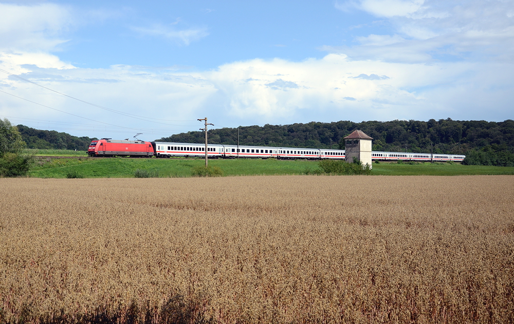 Kurz vor Lonsee ist 101 007 am 4. August 2014 mit dem EC 114 (Klagenfurt-Dortmund) unterwegs Richtung Stuttgart.