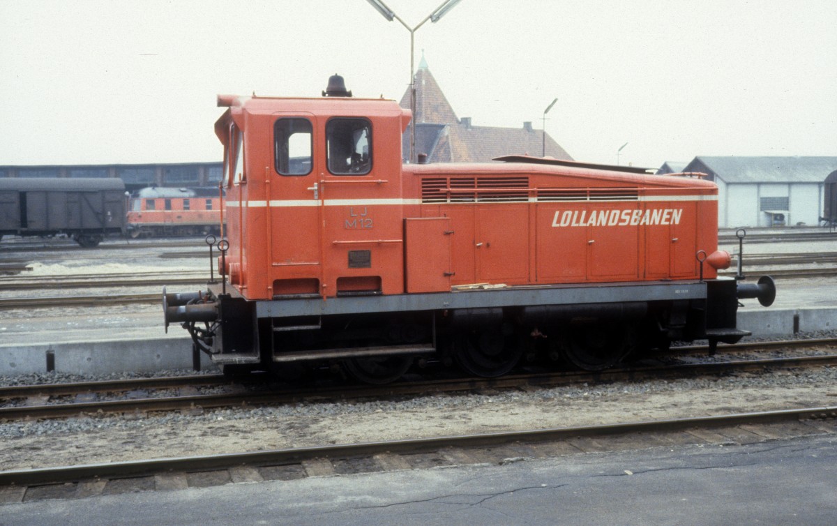 LJ, Lollandsbanen, Diesellok M 12 (Arnold Jung Lokomotivfabrik 1957; Motor: MAN 6-Zylinder-Dieselmotor) Bahnhof Nakskov am 16. Februar 1982.