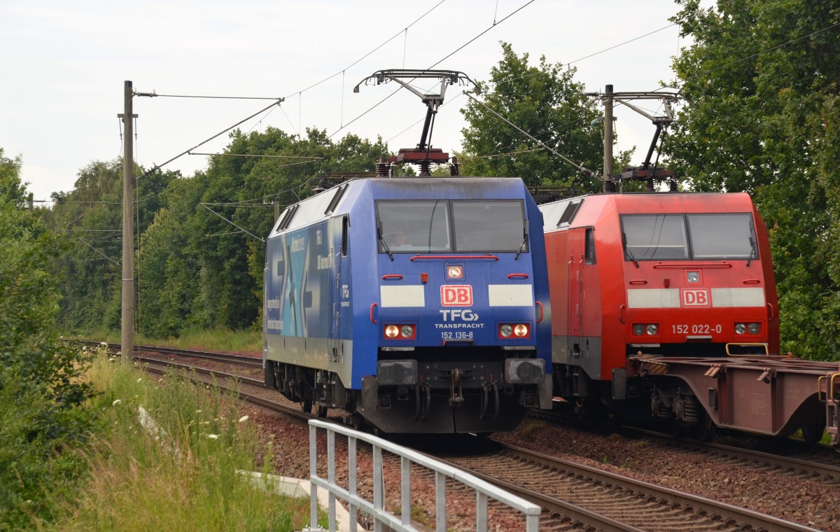 Während 152 022 am 03.07.14 Morrburg gen Harburg verlässt fährt 152 136 Lz in den Hafen um einen Containerzug abzuholen.
