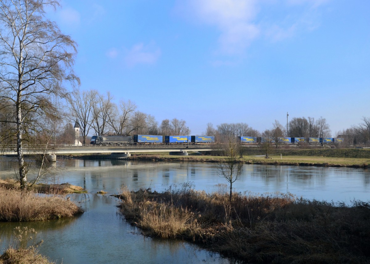 185 152 mit GC 45191 am 21.01.2015 auf der Isarbrücke bei Plattling.