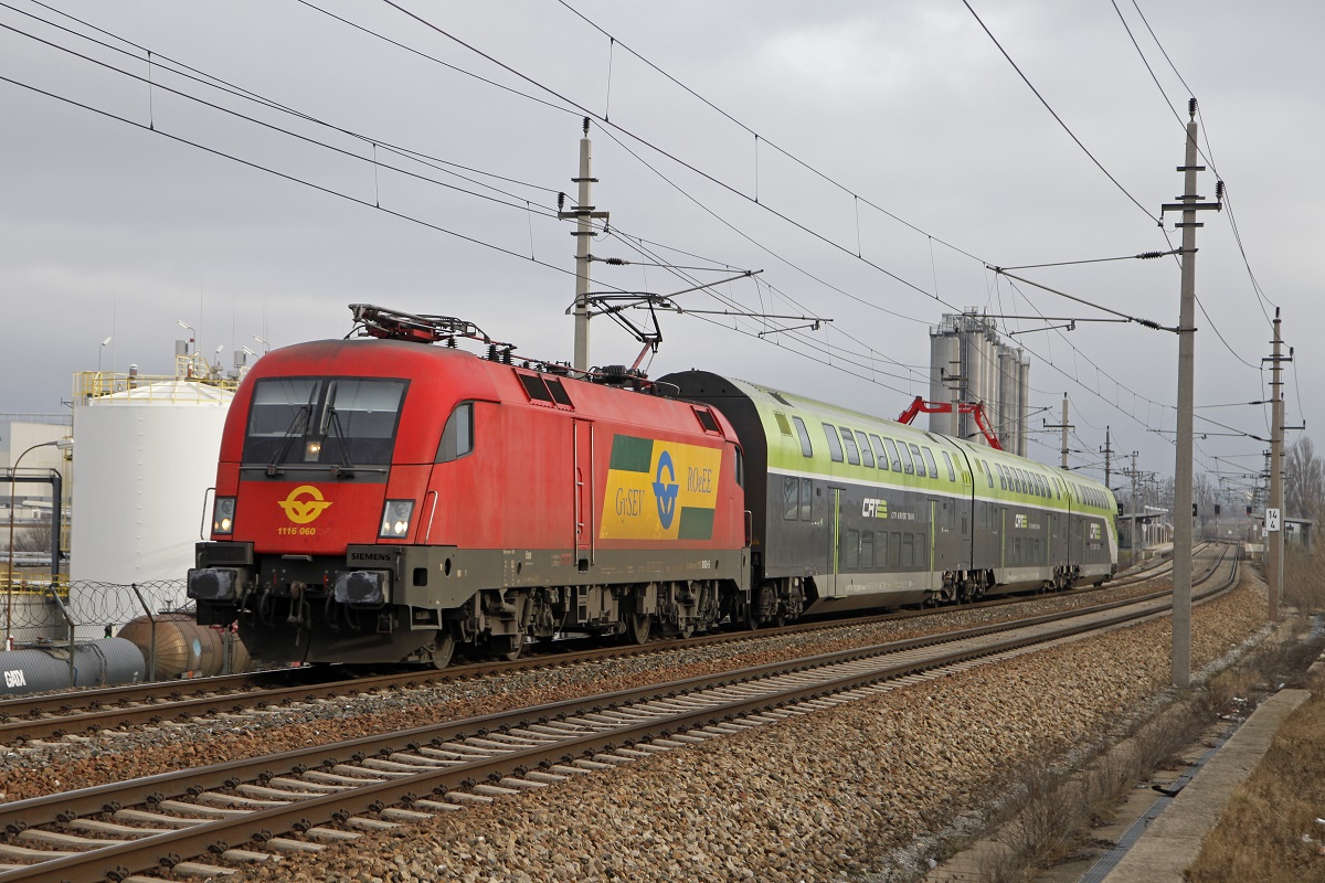 Heute am 22.01.2015 wurde die 1116 060 ausnahmsweise beim CAT (City Airport Train) zwischen Wien Mitte und Flughafen Wien eingesetzt. Hier zu sehen kurz nach der Haltestelle Mannswörth.