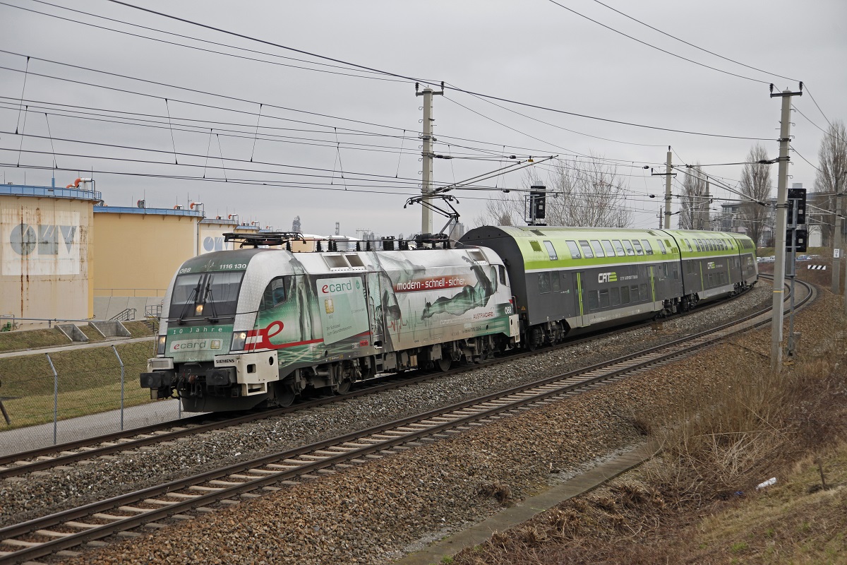 Schon seit ca. drei Wochen wird die E-Card Lok 1116.130 beim CAT (City Arport Train) zwischen Wien Mitte und Flughafen Wien eingesetzt. Hier zu sehen zwischen Mannswörth und Schwechat am 22.01.2015.