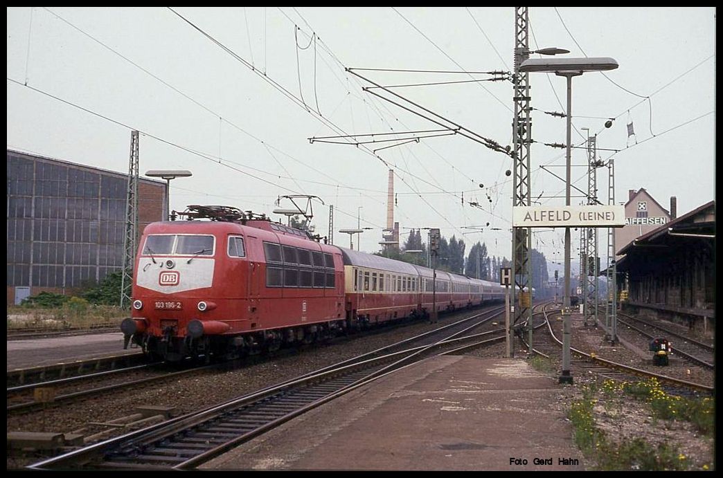 103196 fährt am 10.9.1989 um 11.43 Uhr mit dem Eurocity 77 Mont Blanc Richtung Süden durch den Bahnhof Alfeld an der Leine.
