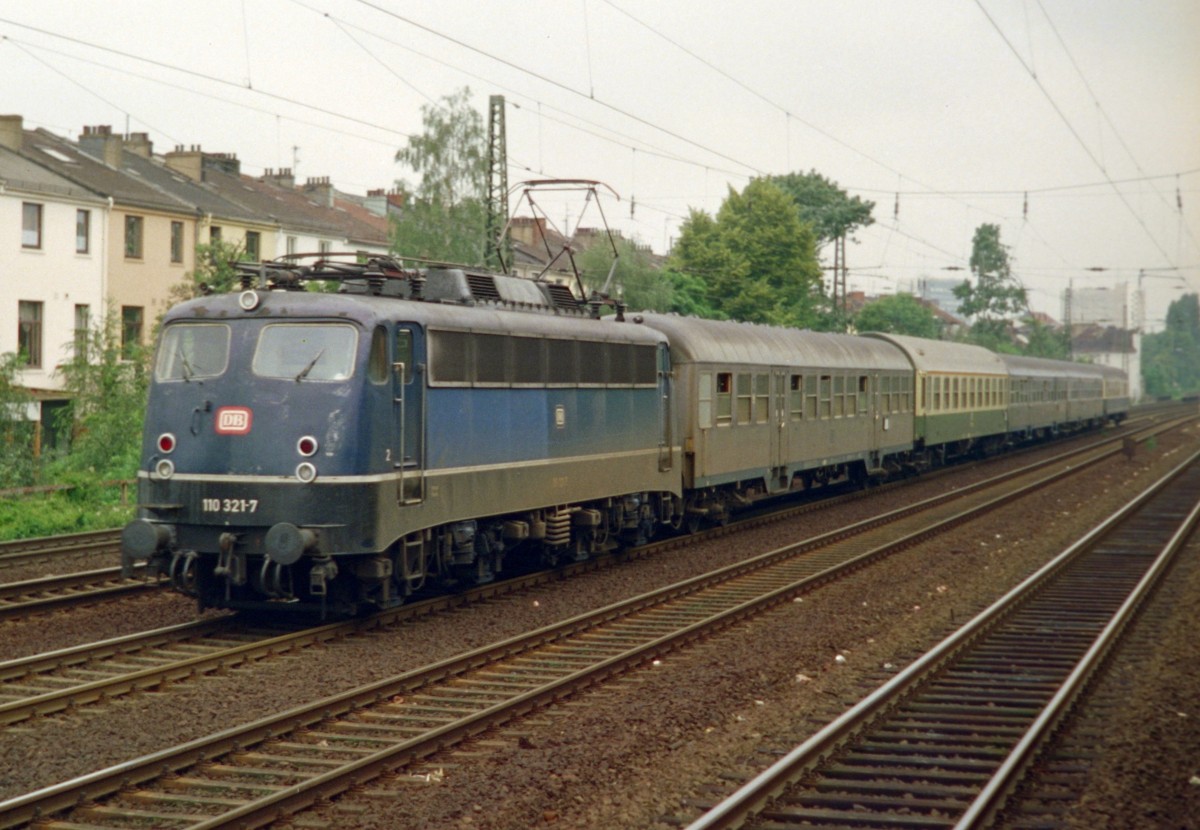 110 321 mit E 3137 (Bremen Hbf–Braunschweig Hbf) am 19.06.1993 zwischen Bremen Hbf und Bremen-Sebaldsbrück, aufgenommen aus N 5035 (Twistringen–Rotenburg [Wümme])