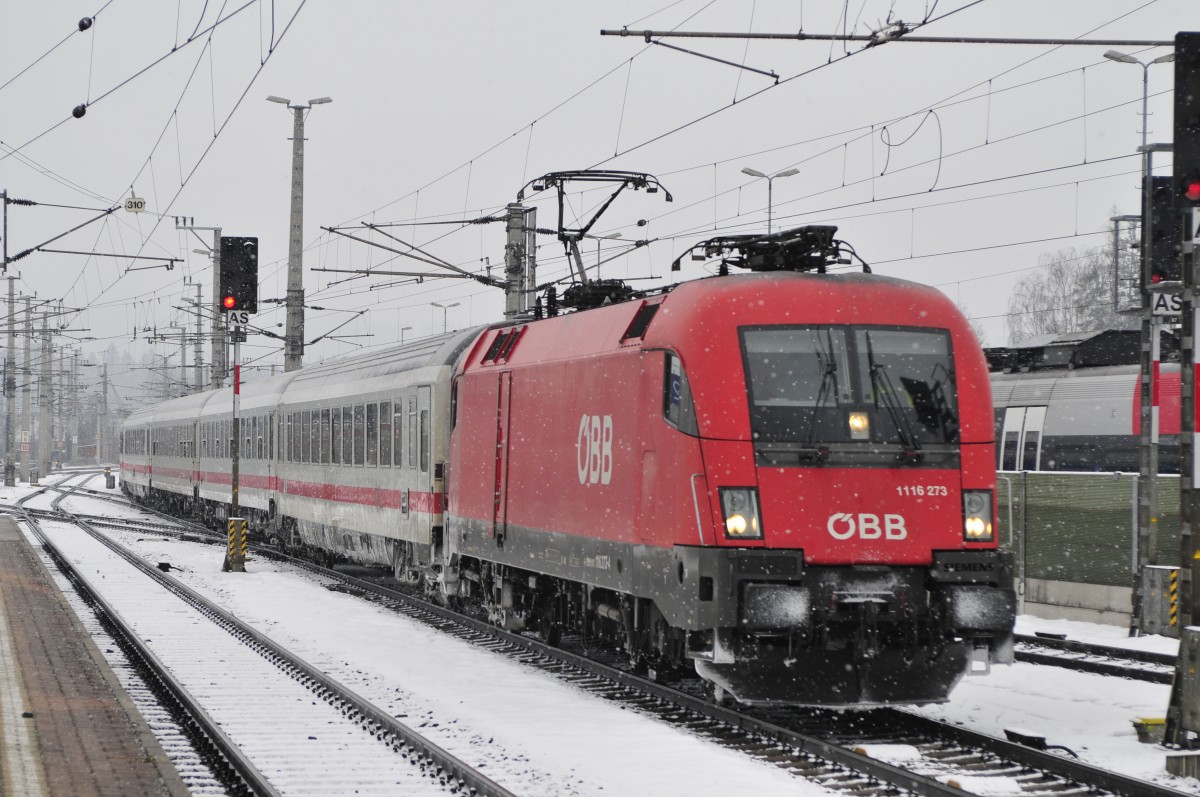 1116.273 mit dem Ic 1280 bei der Einfahrt in Wörgl Hbf und eine leichten Schneefall am 24.1.15
