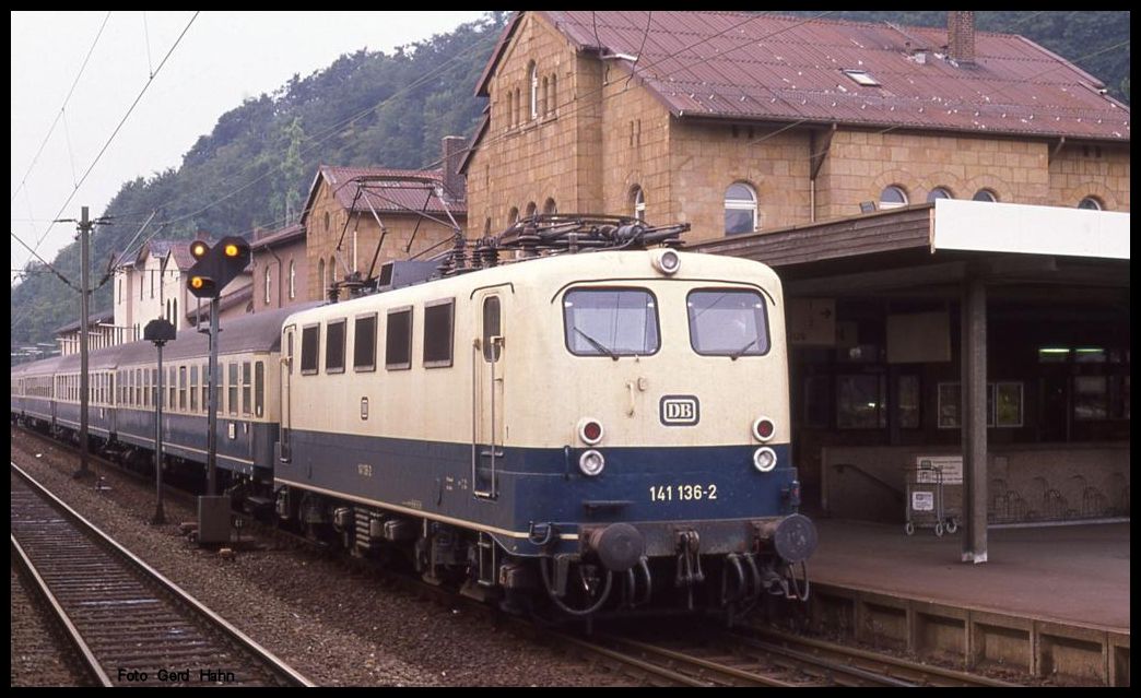 141136 hält am 10.9.1989 um 17.51 Uhr auf dem Weg nach Warburg mit dem E 3662 in Altenbeken.