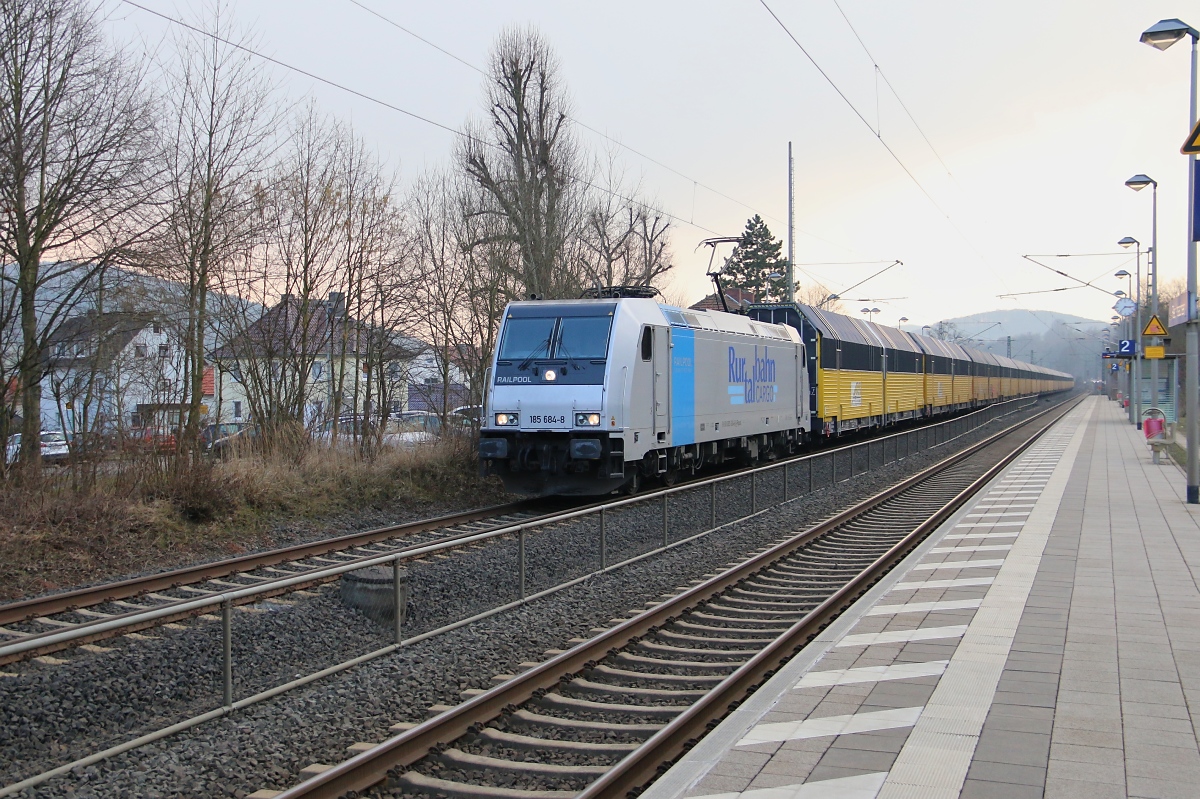 185 684-9 mit geschlossenen ARS-Autotransportwagen in Fahrtrichtung Norden. Aufgenommen in Wehretal-Reichensachsen am 05.03.2014.