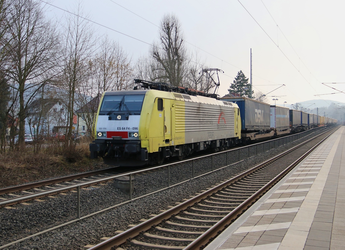 189 996 (ES 64 F4-096) mit KLV-Zug in Fahrtrichtung Norden. Aufgenommen am 05.03.2014 in Wehretal-Reichensachsen.