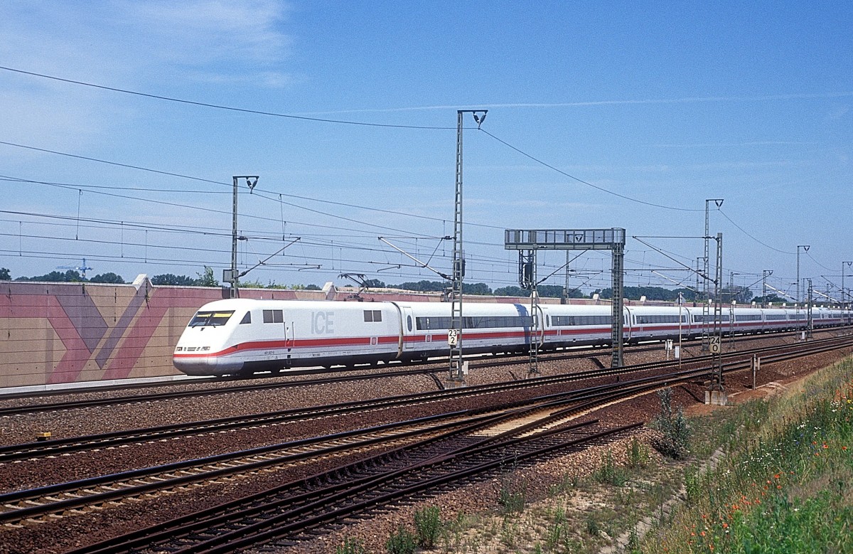 Steuerwagengesichter: der damals schon vom Aussterben bedrohte, aber noch allgegenwärtige Karlsruher Siberling-Kopf im N 5022 (Rotenburg [Wümme]–Twistringen) und ein zum provisorischen Steuerwagen umgerüsteter ICE-Mittelwagen (Mess-/Versuchsfahrten mit 752 001) am 19.06.1993 in Rotenburg (Wümme)