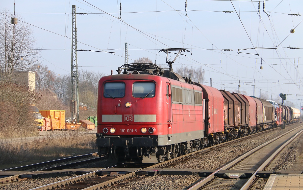 Die erste ihrer Art: 151 001-5 mit gemischtem Güterzug in Fahrtrichtung Süden. Aufgenommen am 08.03.2014 in Eichenberg.