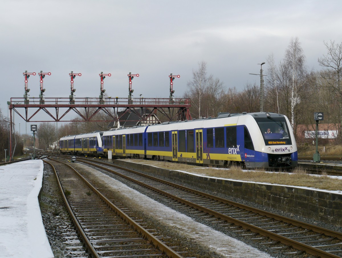 Das beliebte Motiv Signalbrücke in Bad Harzburg diesmal mit erx 83703 als Harz-Heide-Bahn aus Hannover; 24.01.2015
