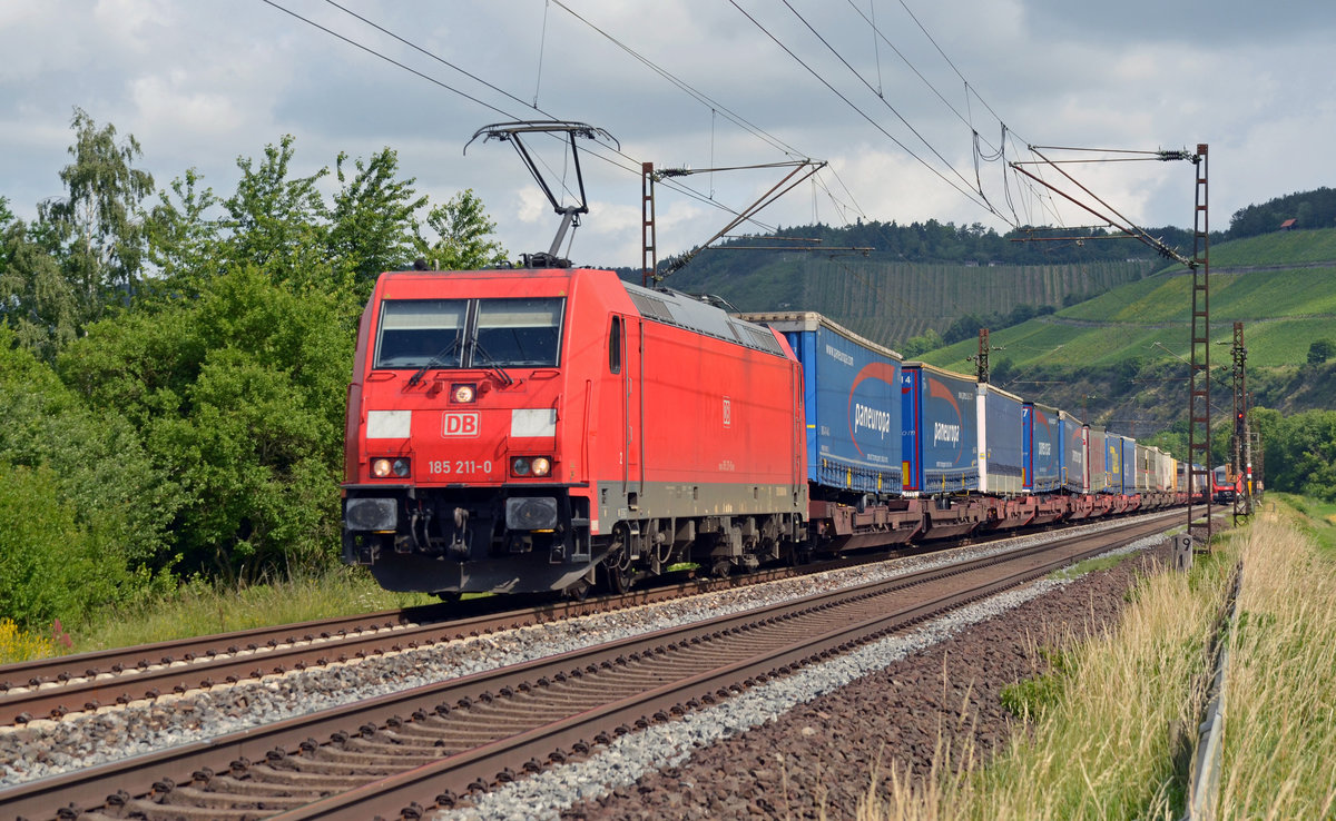 185 211 schleppte am 16.06.17 einen KLV-Zug durch Himmelstadt Richtung Würzburg.
