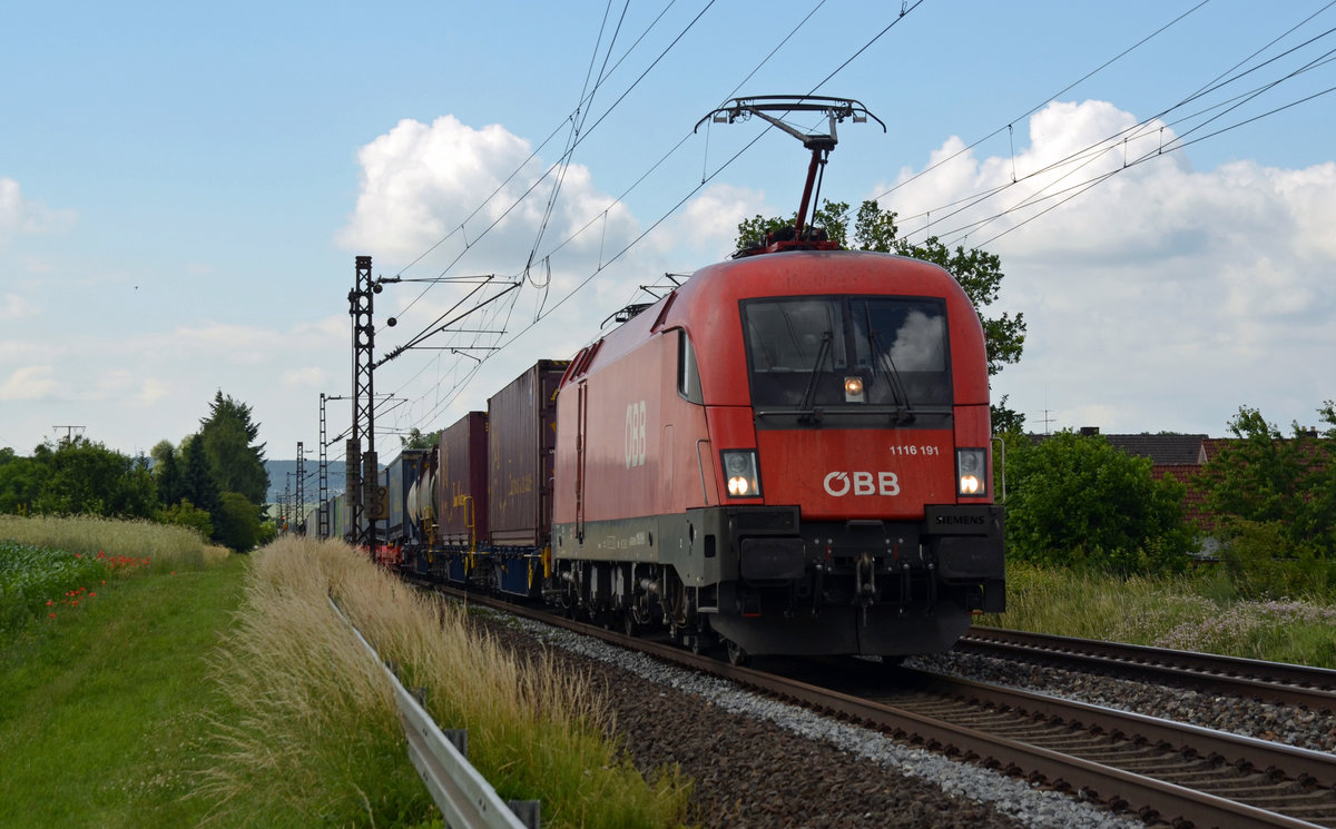 Mit einem KLV-Zug am Haken fuhr 1116 191 am 16.06.17 durch Himmelstadt Richtung Gemünden.