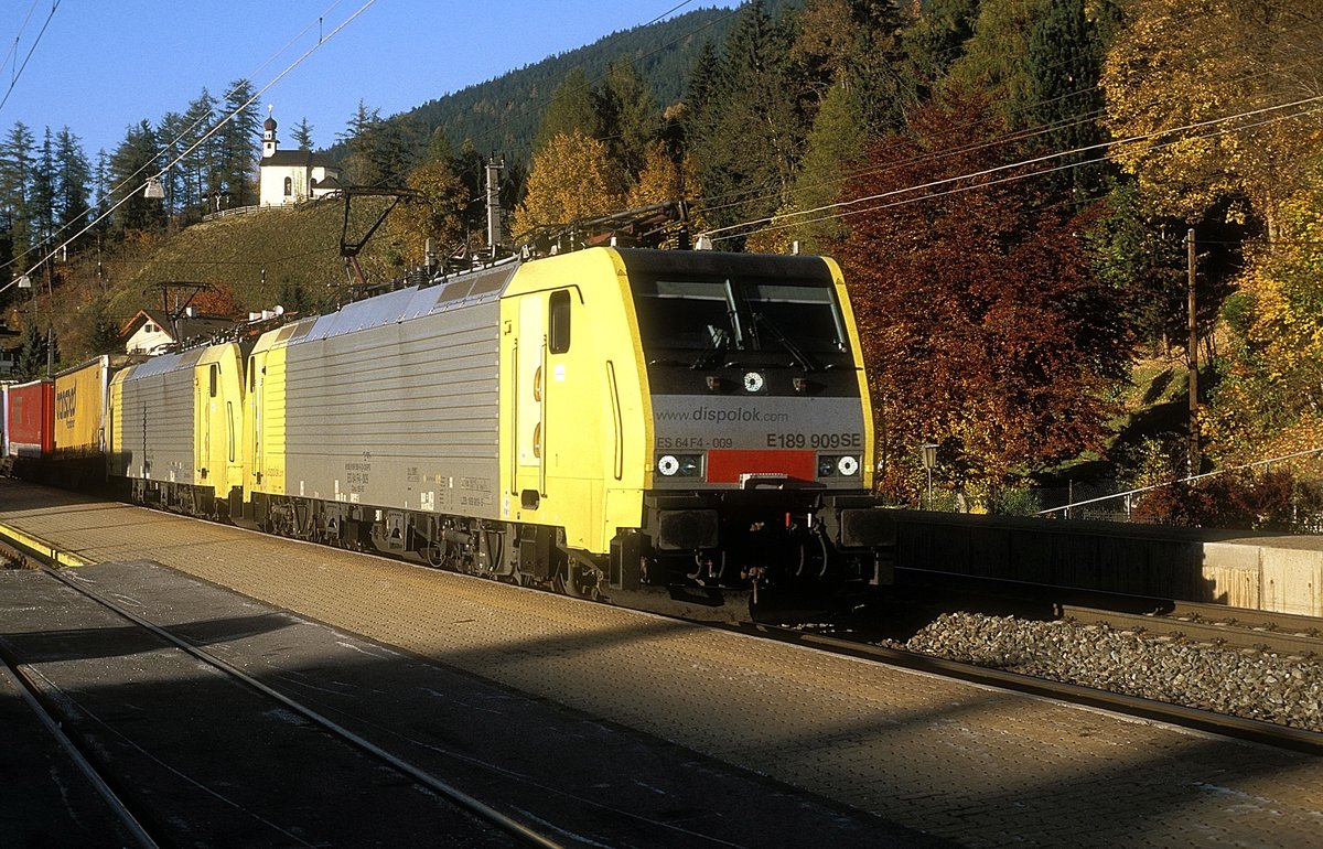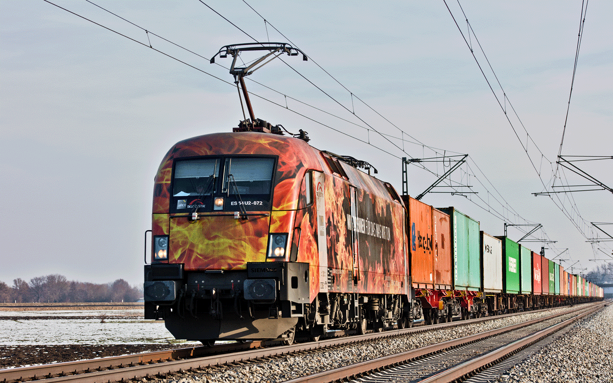 Die ES 64-U2-072 donnert in Niedermünchsdorf mit einem Containerzug nordwärts.Bild vom 11.2.2017