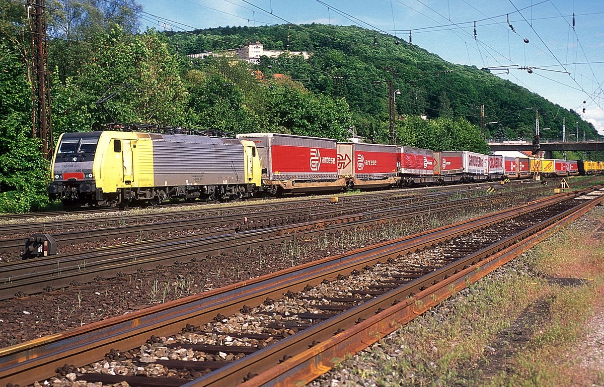486 504 der BLS mit KLV-Zug in Fahrtrichtung Rüdesheim. Aufgenommen am 16.07.2015 bei Lorch am Bächergrund.