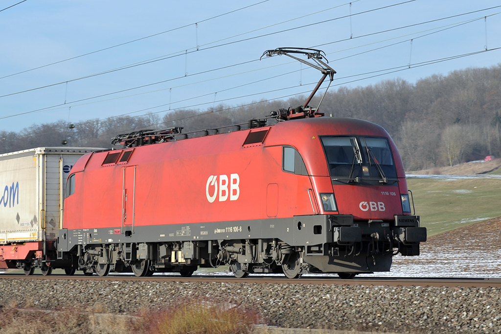 Eine 1116 durchfährt mit einem kurzen Güterzug im Februar 2005 Neumarkt in der Steiermark